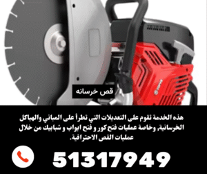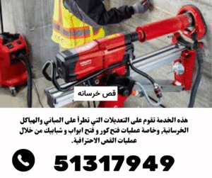 نقدم لكم في شركتنا عملائنا الاعزاء افضل خدمات قص و تخريم الصبات الاسمنتية و صنع فتحات من كافة الاحجام و القياسات مع إلتزام تام بالمخططات و المقاييس المعتمدة التي يطلبها العميل من الشركة، أحدث معدات العمل و اكثرها تنوع و شمولية بالاضافة الى وجود كادر عمالي متكامل التخصصات و الخبرات و الكفاءات، تواصلوا معنا من اي مكان في الكويت لأننا نعمل من اجل خدمتكم.