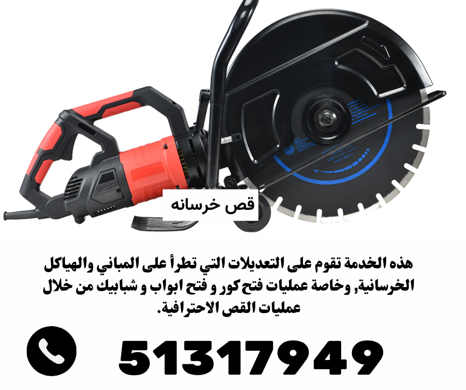 نقدم لكم في شركتنا عملائنا الاعزاء افضل خدمات قص و تخريم الصبات الاسمنتية و صنع فتحات من كافة الاحجام و القياسات مع إلتزام تام بالمخططات و المقاييس المعتمدة التي يطلبها العميل من الشركة، أحدث معدات العمل و اكثرها تنوع و شمولية بالاضافة الى وجود كادر عمالي متكامل التخصصات و الخبرات و الكفاءات، تواصلوا معنا من اي مكان في الكويت لأننا نعمل من اجل خدمتكم.